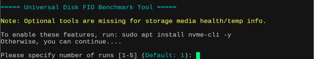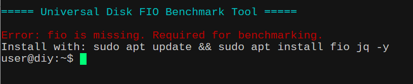 fio: The core benchmarking tool used to perform the actual I/O tests. Without this, the script cannot execute the storage tests (SEQ1M,RND4K, etc.).jq: A lightweight command-line JSON processor used by the script to parse and extract bandwidth results from thefiooutput. The script requestsfioto output results in JSON format.jqis used to pull specific numbers (likebwfor bandwidth) out of that complex data so it can be averaged and displayed.